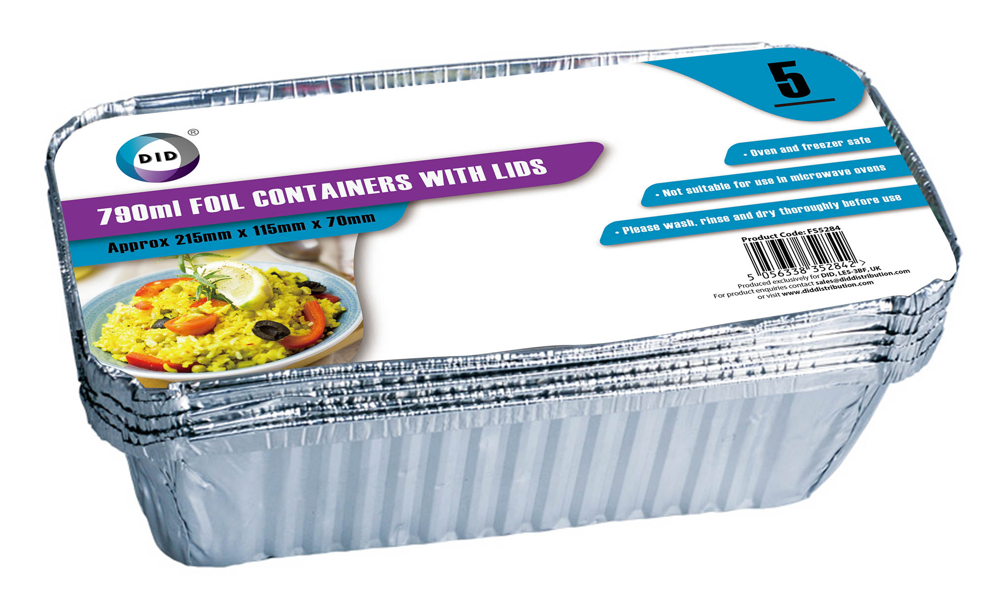 5pc 790ml foil containers with lids (approx 215mm x 115mm x 70mm)